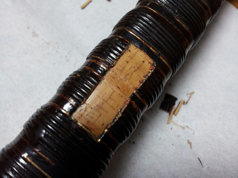 以前、書いた塗り弓についてですが (http://kyudo.ya-gasuri.com/Entry/42/) 銘が気になったので塗りを一部、剥がしました。 銘は塗りと同じく「打越正直」のようです。 単一材の弓ではなく竹弓でした。
